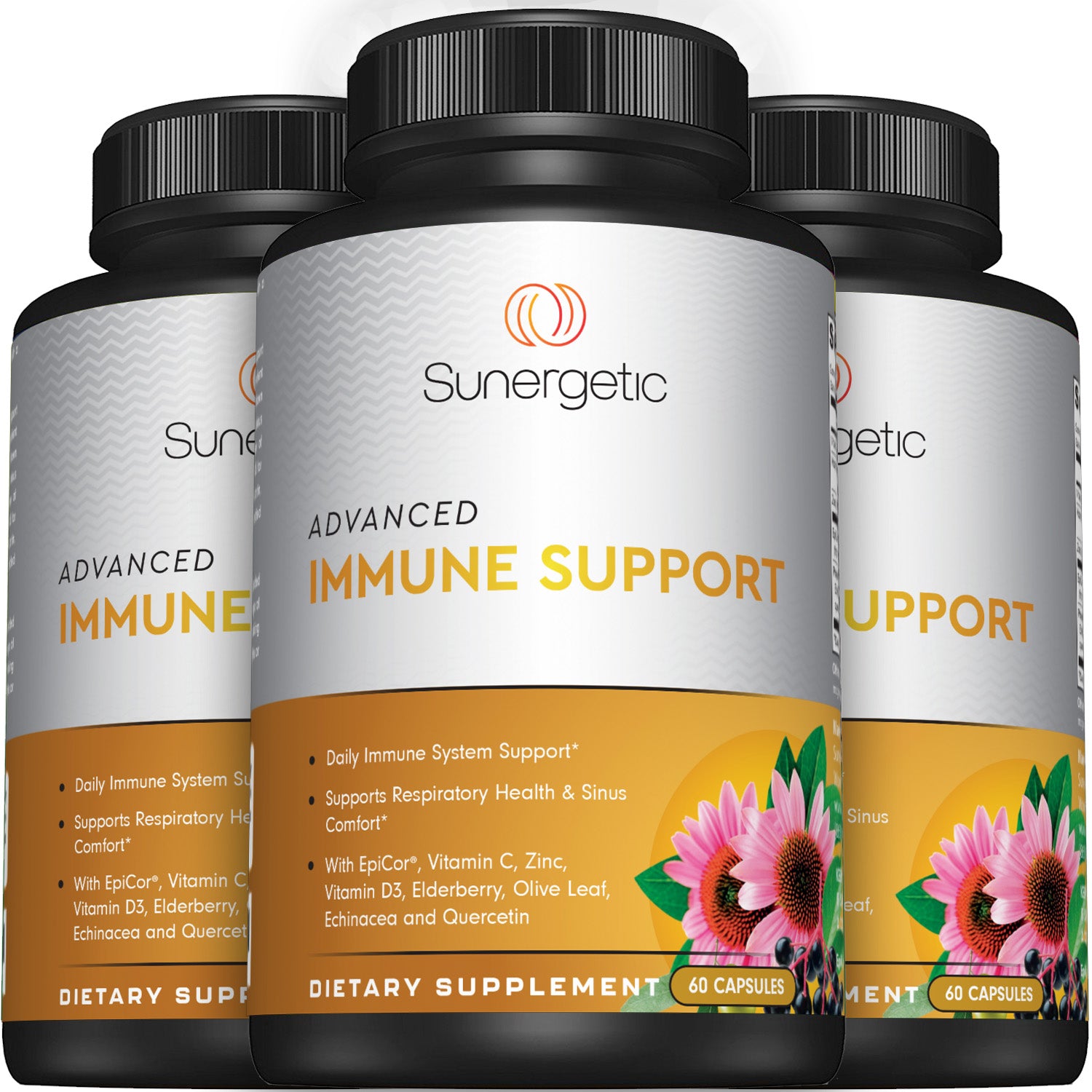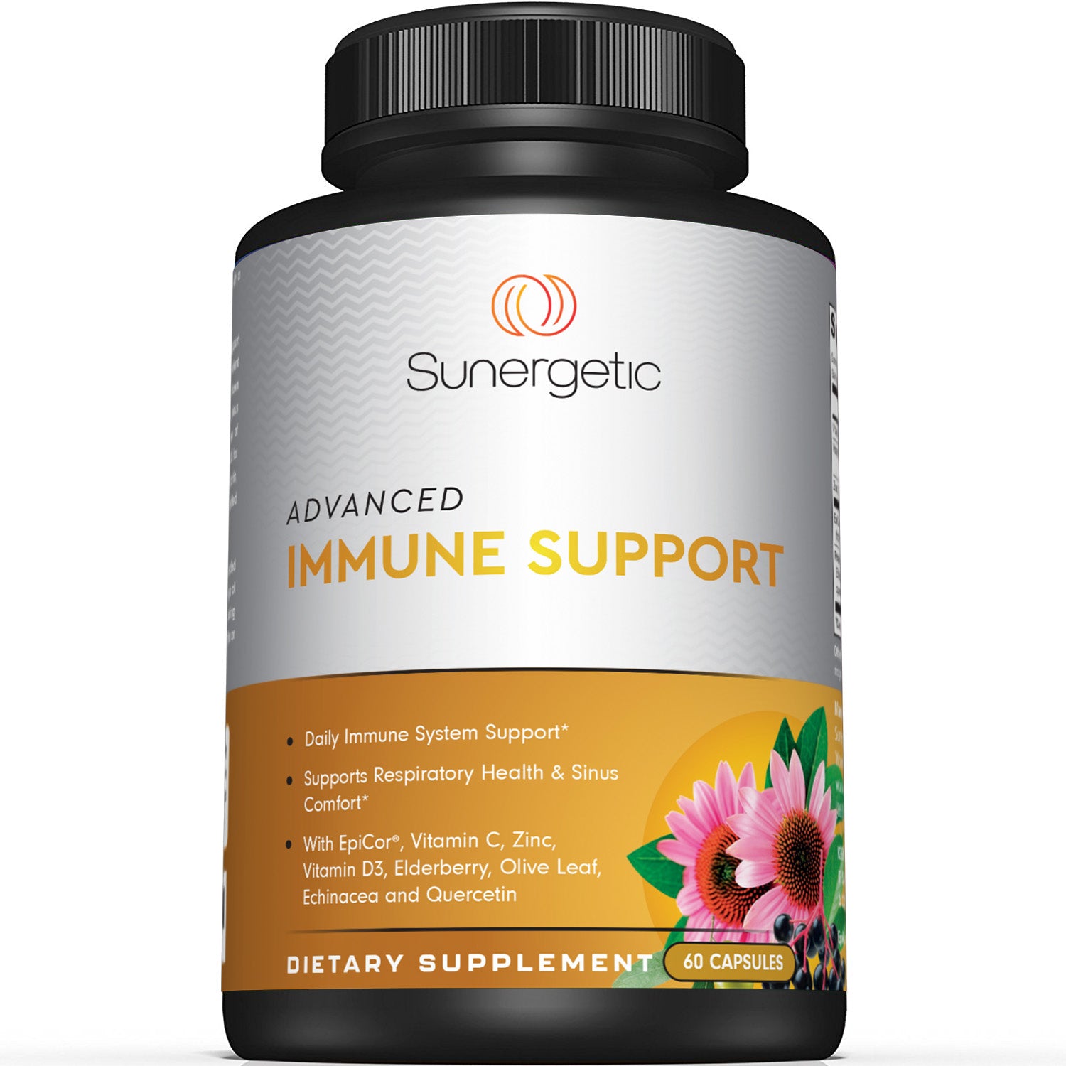 POWERFUL HERBAL IMMUNE SUPPORT COMPLEX: Sunergetic’s Immune Support Supplement is formulated with Black Elderberry Extract, Quercetin, Echinacea and Olive Leaf Extract to help support overall wellness.* Our Immune Support formula includes a powerful dose of Vitamin C, Vitamin D3 and Zinc to support healthy immune function.* With Sunergetic's Advanced Immune Support Supplement, you are getting the benefits of clinically studied Epicor® along with well known vitamins and herbs.