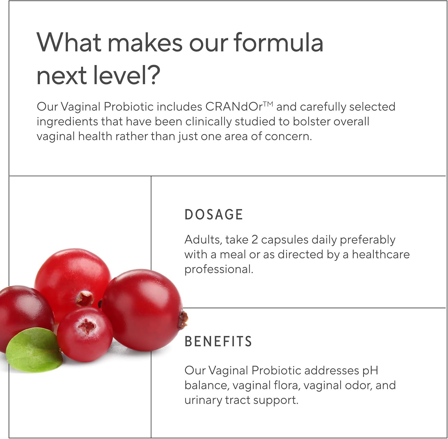WITH CRANBERRY FOR URINARY TRACT:We use Cran d’Or cranberry, a powerful cranberry from Canada standardized to Proanthocyanidins (PACS) to promote urinary tract support. Achieve intimate support with our 3-in-1 formula—probiotics, prebiotic, and cranberry extract—for overall daily vaginal health.*