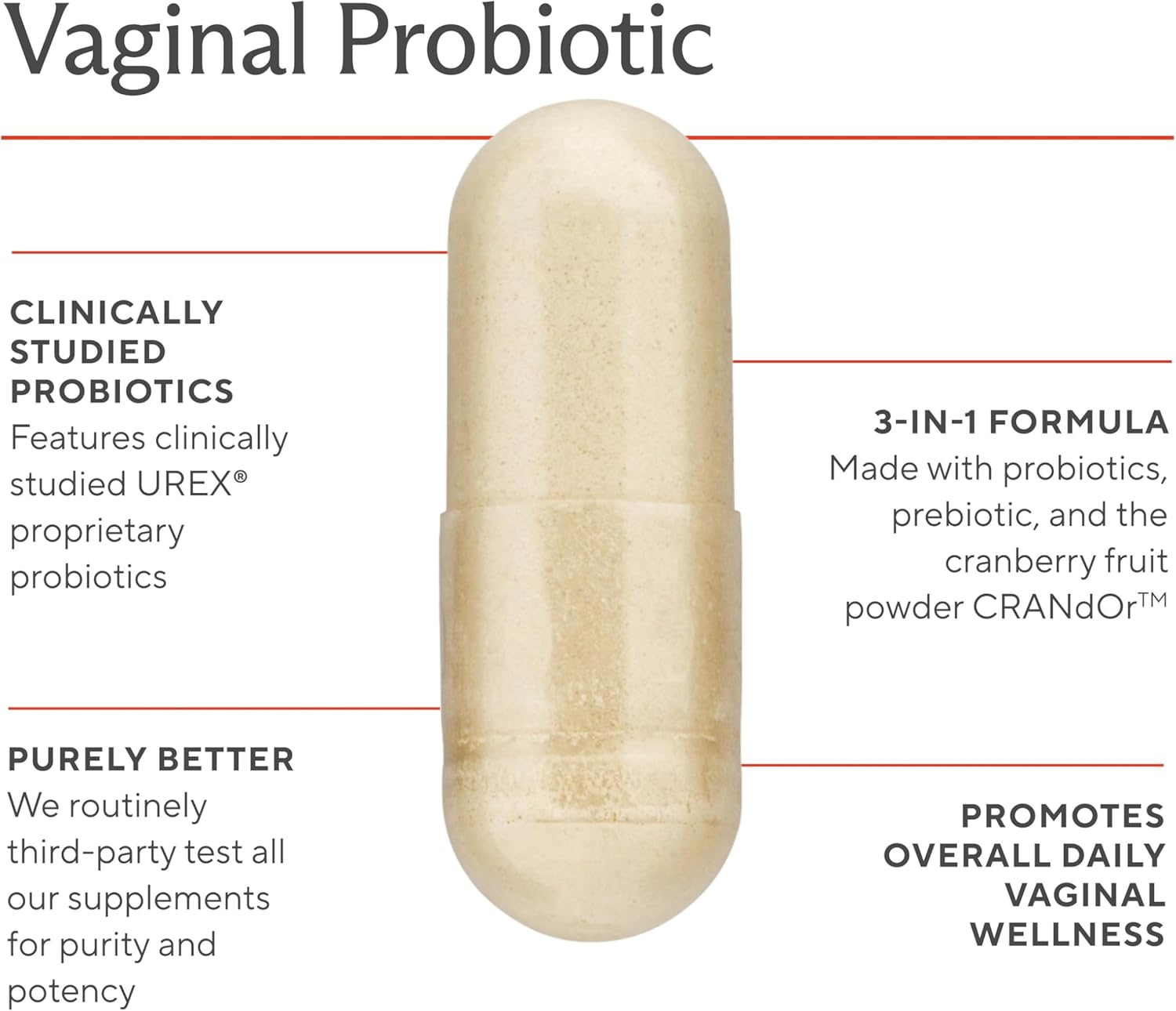 CLINICALLY STUDIED UREX PROBOTIC:Unlike other vaginal probiotics for women, we use UREX, a clinically studied probiotic blend of lactobacillus rhamnosus and lactobacillus reuteri that has shown in multiple clinical studies to support vaginal health, ph balance and support vaginal flora and urinary tract health.* Our daily probiotics for women are packed with a prebiotic to support normal digestion and gut health.*